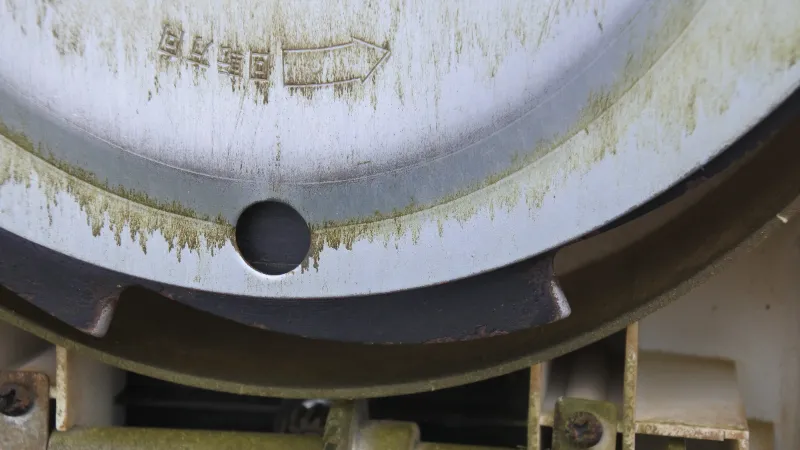 回転方向の矢印がプリントされている面を古いのと同じに揃えて取り付けると、芝生に当たる面が逆になるのです。