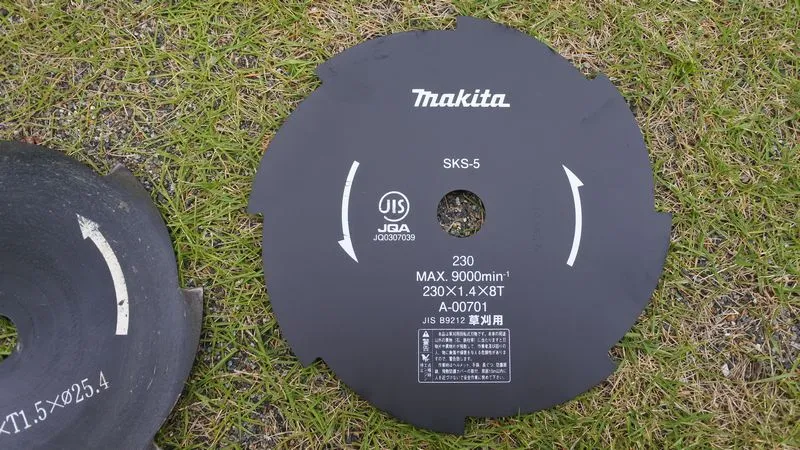 機種の型番と純正品の写真から、おそらく230mmの草刈り・芝刈り用の8枚刃で良いはずです。