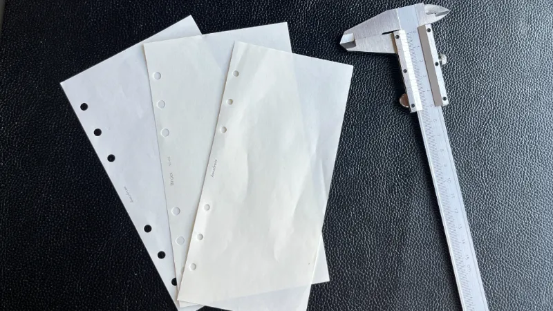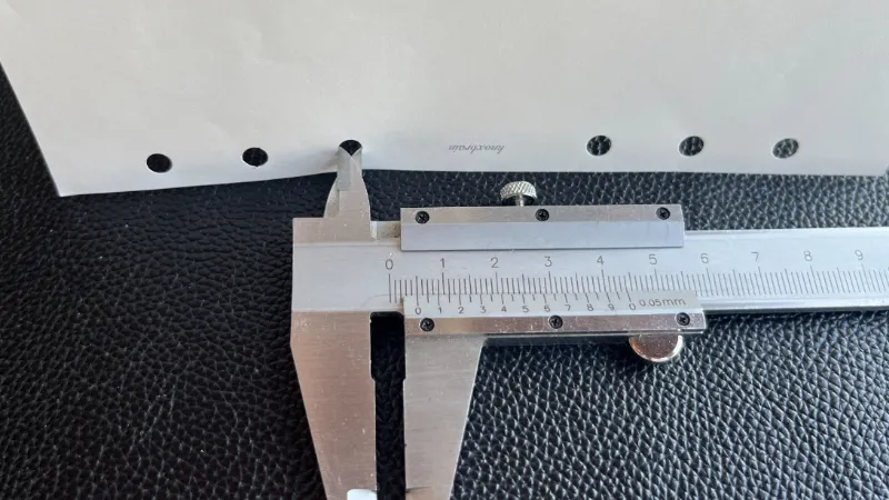 薄い紙なので、ノギスのクチバシで穴が広がってしまう恐れがありますが、なるべく無理がかからないように測定しました。