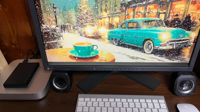目的はYoutube視聴だけなので、それほど高音質のオーディオ装置は必要ないのですが、さすがにMac mini内蔵のスピーカーや液晶モニターのスピーカーでは貧弱過ぎるので、手持ちのUSB接続のスピーカーを繋げてあります。