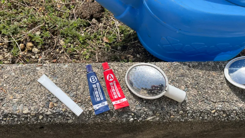 この時は、エポキシボンドではなく、「水漏れテープ」を買ってきて、割れた部分に巻き付けたり、穴を塞いだりしたのですが、その「水漏れテープ」自体が紫外線の影響か、すぐに剥がれてしまい、結局、如雨露自体を廃棄したという苦い経験があります。